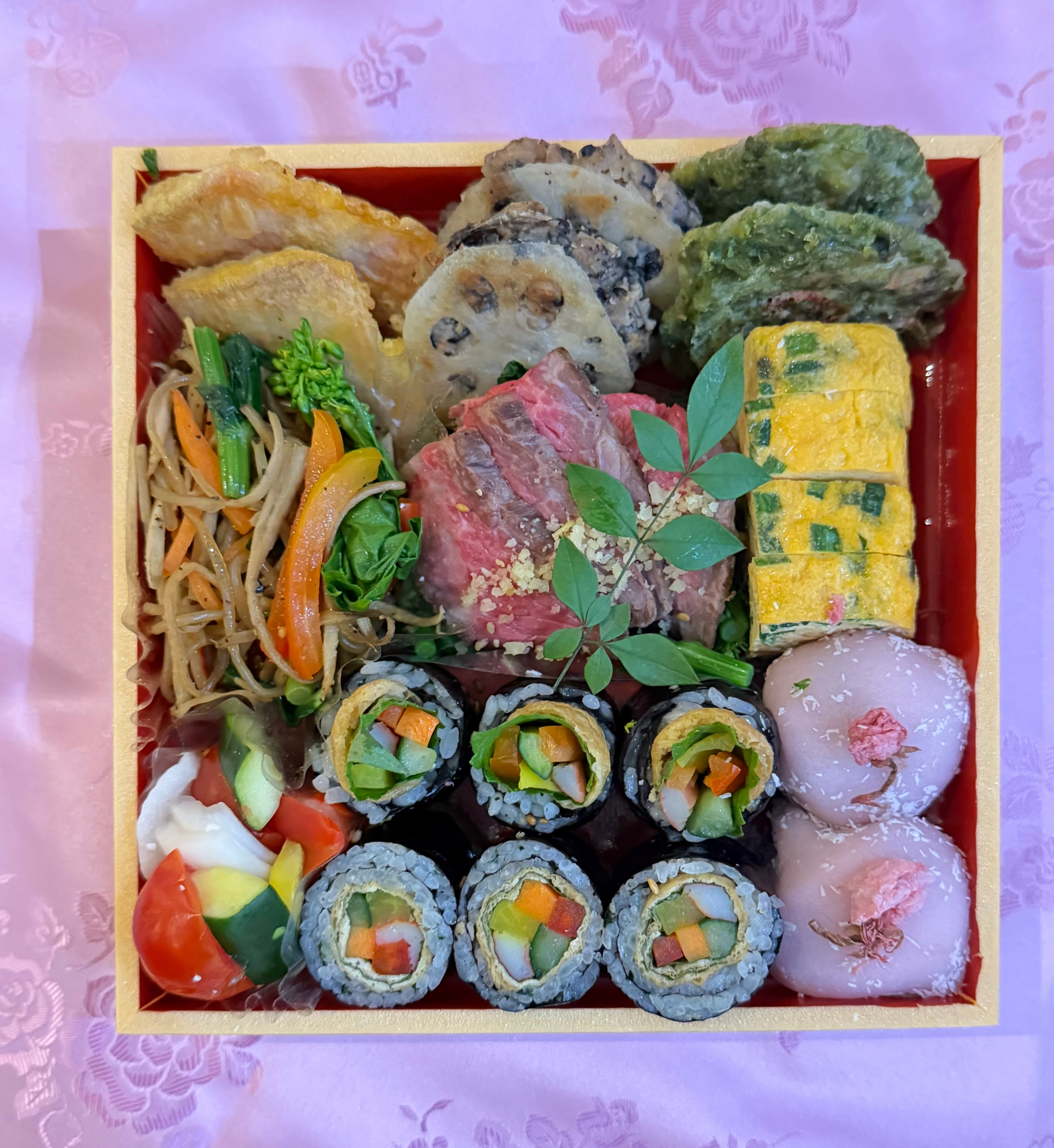 삼색전(3色ジョン)、유부김밥(油揚げキンパプ)、ローストビーフなど
